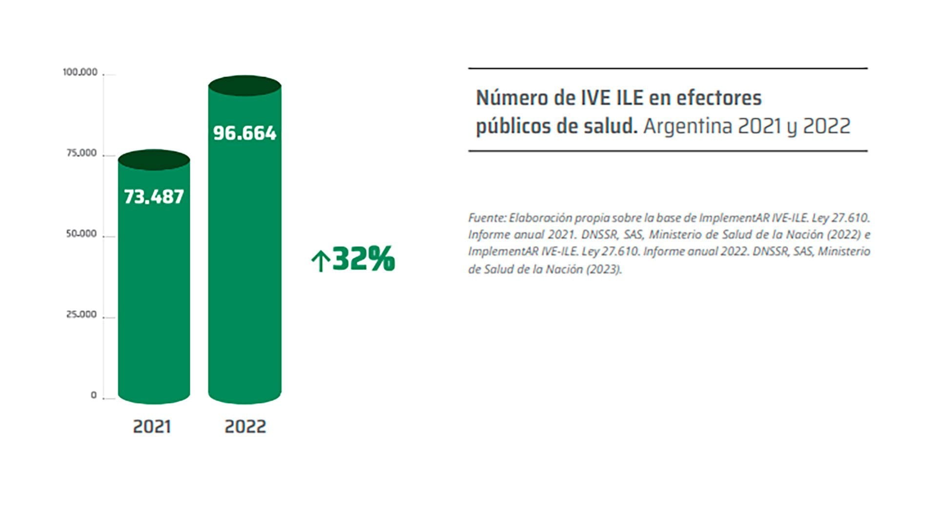 Un siguiente dato que se destaca es el aumento del 98% de los servicios del sector público con atención de interrupción voluntaria del embarazo (IVE) e interrupción legal del embarazo (ILE). Antes de la sanción de la ley, a fines de 2020, se contabilizaban 907 efectores que garantizaban abortos en centros de atención primaria de la salud y en hospitales; en 2021 ya eran 1327; y 1793 en 2022.