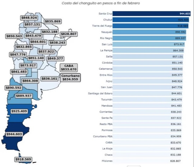 El ranking de las provincias con el changuito más caro está encabezado por Santa Cruz, donde la canasta alcanza los $944.603. Le siguen Chubut ($925.409), Tierra del Fuego ($918.569), Neuquén ($890.592), Río Negro ($889.937), San Luis ($873.917) y luego La Pampa.