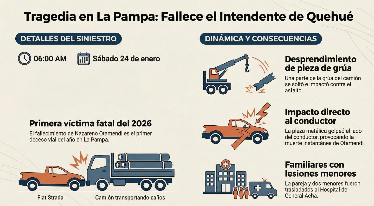 Nazareno Otamendi circulaba en una camioneta, que chocó contra un camión. La ruta provincial, entre Quehué y la Nacional 35, se encuentra cortada. Es la primera víctima fatal en siniestros viales del 2026.